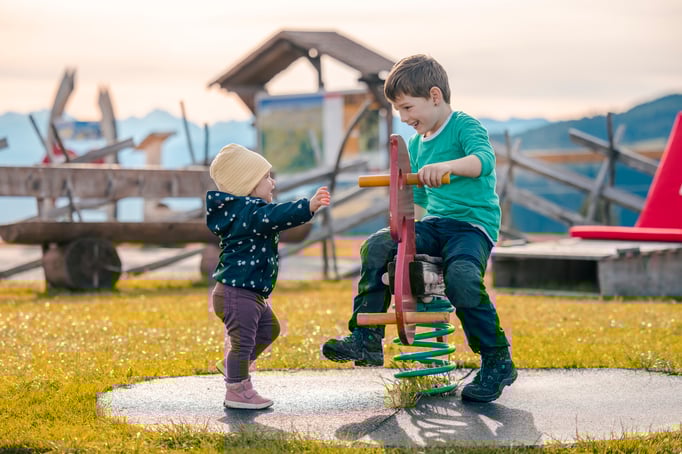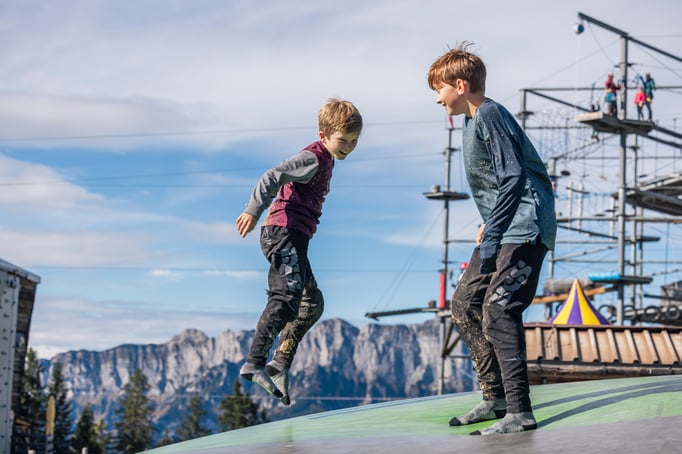 Das Erlebnis-Angebot auf Prodalp ist gross - neben dem Laufrädli-Parcours können sich die Kinder auch auf dem Spielplatz oder dem riesigen Hüpfkissen vergnügen. Wer hüpft am höchsten?